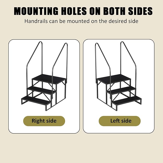 - 【Handrails for Outdoor Steps】: Our trailer ladder has mounting holes on both sides, so you can install the handrail on either side. Whether you're getting in and out of your motorhome or using our hot tub stairs for other tasks, railing can provide you with extra security