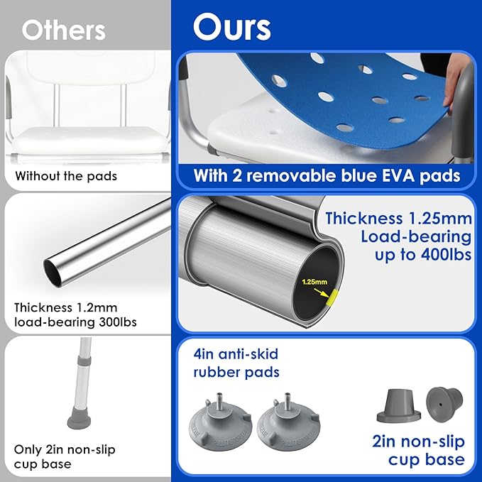 - EVA Pads & Shower Head Holders: The swivel shower chair for inside shower comes with 2 removable blue EVA pads for softness and warmth, quick to dry. 2 shower head holders are also included.