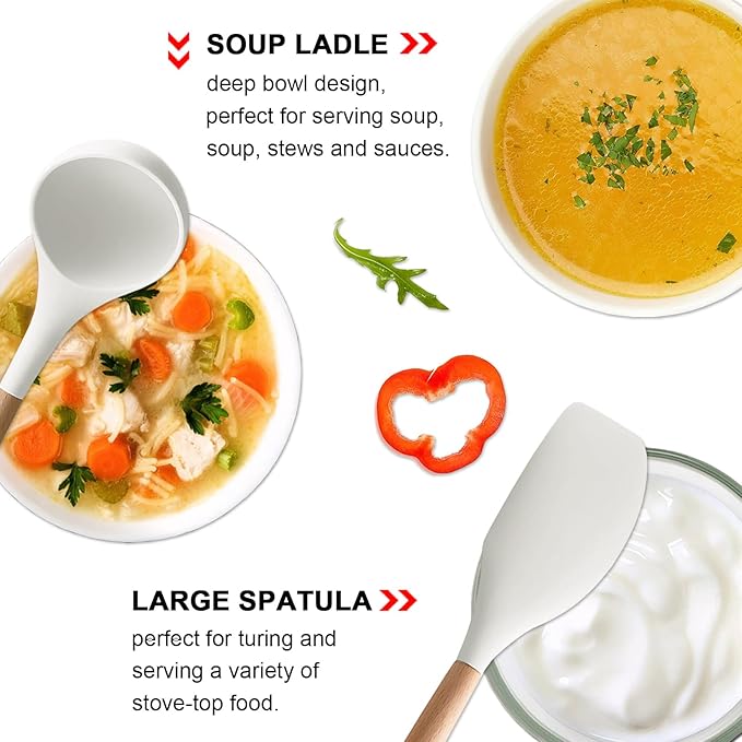 - 【FOOD GRADE SILICONE & WOODEN HANDEL】Non-scratch food grade silicone and natural acacia wooden handles, BPA-free. This silicone cooking utensil does not react with food or beverages, or produce any hazardous fumes, allowing for healthy cooking while protecting your cookware. The wooden handle feels comfortable and strong to hold, prevents heat transfer, protecting your hands from being scald and allows you to enjoy cooking for long time without feeling tired.
