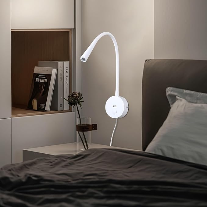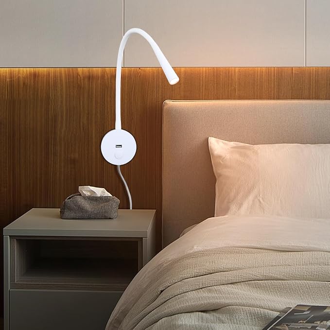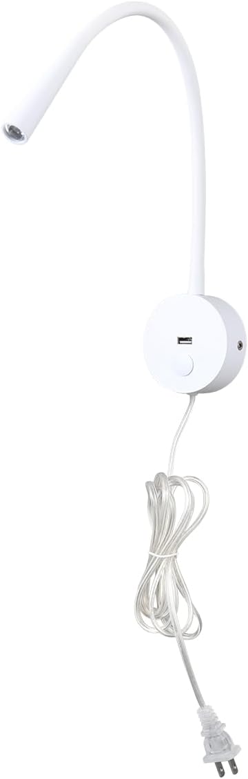 Wall Mounted Reading Lamp USB Charger Matt White LED 3W Warm White 3000K Plug for Reading (White USB Charger Dimmer 2pcs)