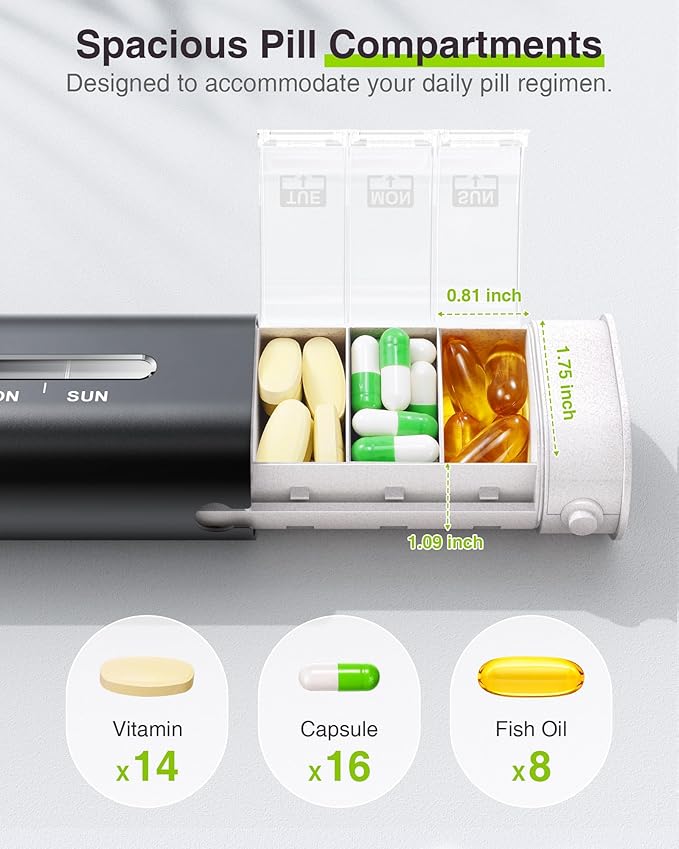 - 【Spacious 7-Day Compartments for Your Weekly Regimen】 The aluminum weekly pill organizer features seven generous compartments, each accommodating up to 8 fish oil capsules, 16 standard capsules, or 14 large vitamin tablets. Measuring just 6.94 × 2.45 × 1.44 inches, it combines high capacity with a slim, portable profile that fits effortlessly into luggage, backpacks, or purses. Whether you’re searching for a large pill organizer, daily pill organizer, or a cute pill organizer to brighten your daily routine, this 7 day pill organizer small design has you covered.