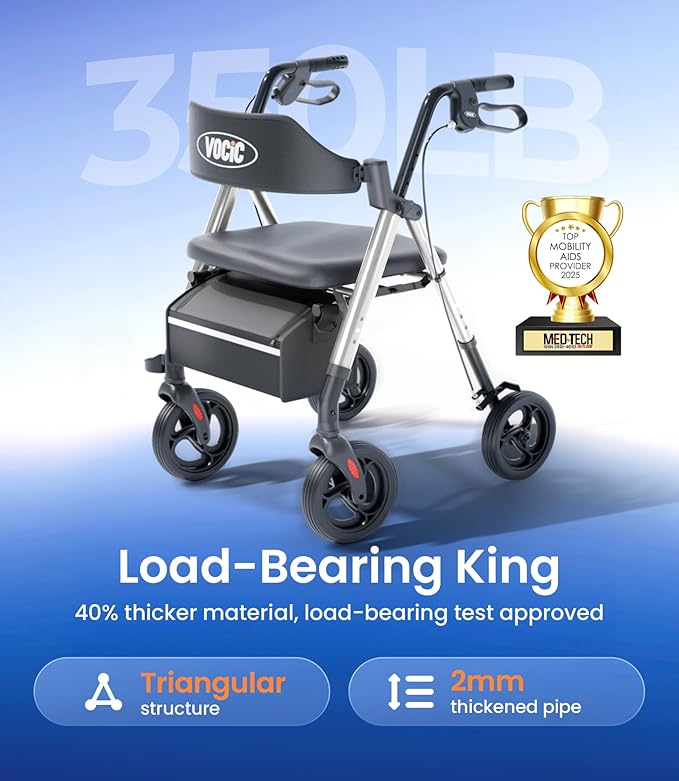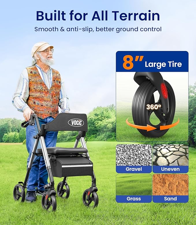 VOCIC Walkers for Seniors, Z21 Rollator Walker with Seat Supports 350lb, 8" Big Wheels for All Terrain, Ergonomic Arc Seat & 6" Ultra Backrest Foldable Walker, Dual Height Adjustment, Lightweight 2025