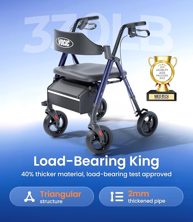 VOCIC Walkers for Seniors,Foldable Walker with Seat,Rollator Walker with Durable Aluminum,8" Big Wheels for All Terrain, Ergonomic Seat and Backrest,Dual Adjustable Height Rolling Walker| Pashion Blue