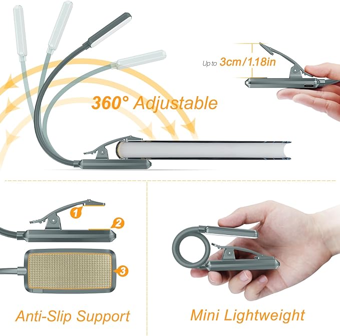 - 360° Flexible Neck & Sturdy Clip: 360° bendable goose neck can be rotated to any angle you want. Anti-skid clip design makes it firmly clamp on an e-reader, books, shelf, etc