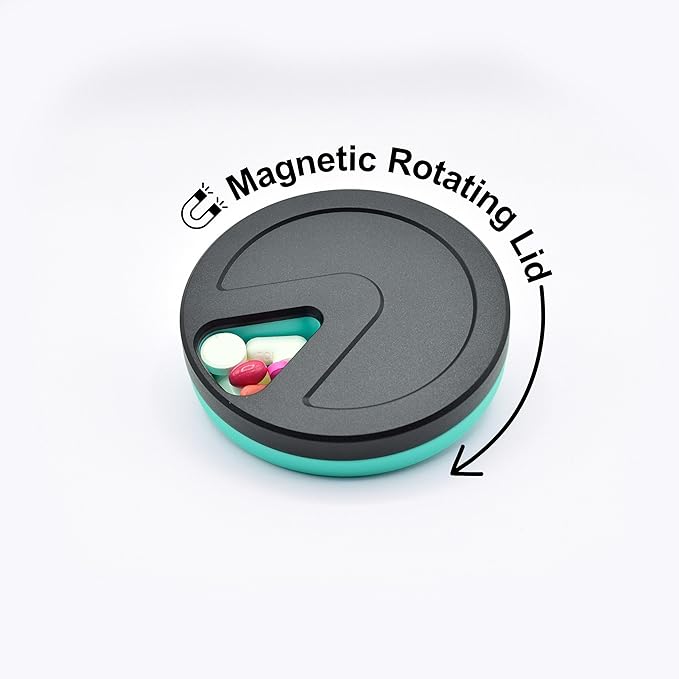 - CONVENIENT: The lid rotates smoothly and indexes automatically to each pocket so that you can easily pour out the day's pills. The lid can be removed for filling simply by turning it halfway between the pockets and lifting. The lid automatically centers and reattaches itself via the magnets.