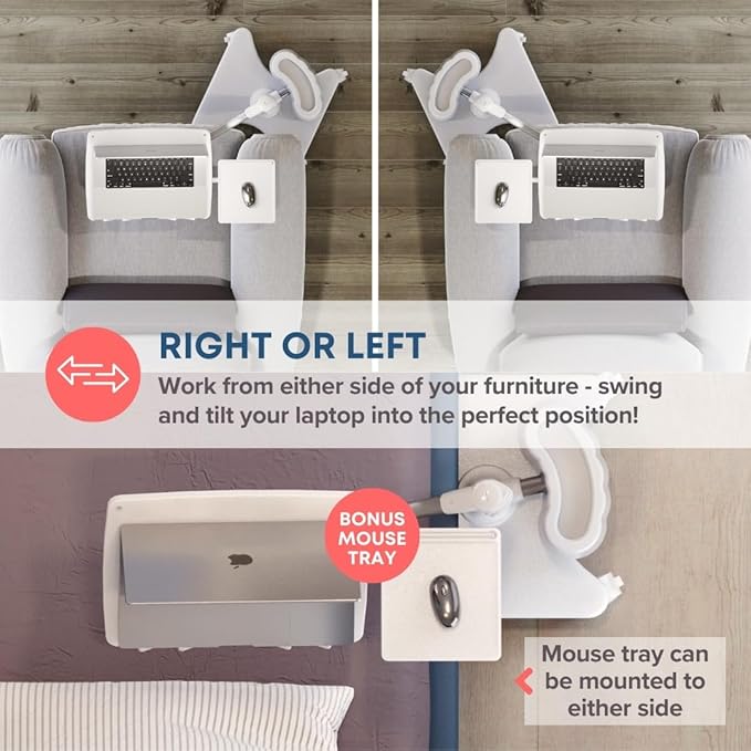 - PREMIUM ROLLING DESK WITH ERGONOMIC DESIGN – Built from anodized aluminum and durable polymers for long-lasting strength. Space-saving base hugs furniture corners while the swing arm extends over your lap. Locking casters make moving between rooms easy. Patented mouse tray stays level when swiveling and can be positioned left or right. Designed from decades of user feedback for comfort and stability.