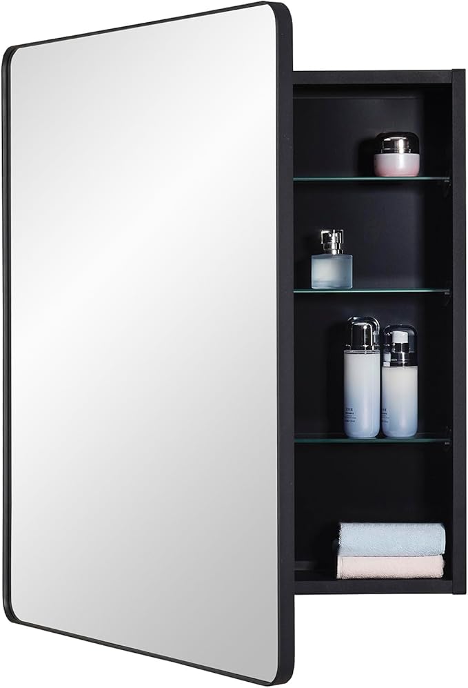 Black Bathroom Mirror Medicine Cabinet with Round Corner Framed Door 24 x 30 inch, Recessed or Surface Mount, with Adjustable Glass Shelves