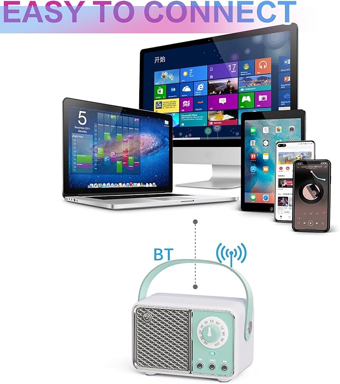 - 【 Bluetooth 5.0 technology& Crystal Clear Sound】: Equipped with advanced technology, compatible for all Bluetooth iPhone iPad Tablet .With the advanced Bluetooth5.0 technology, maintain a strong connection up to 32.8ft this retro Bluetooth speaker could connect with your smart equipment in less than one second.Cute Stereo Ultra mini but super loud. Whether you listen to country music, rock music or popular music, it will let you feel at the real concert scene.