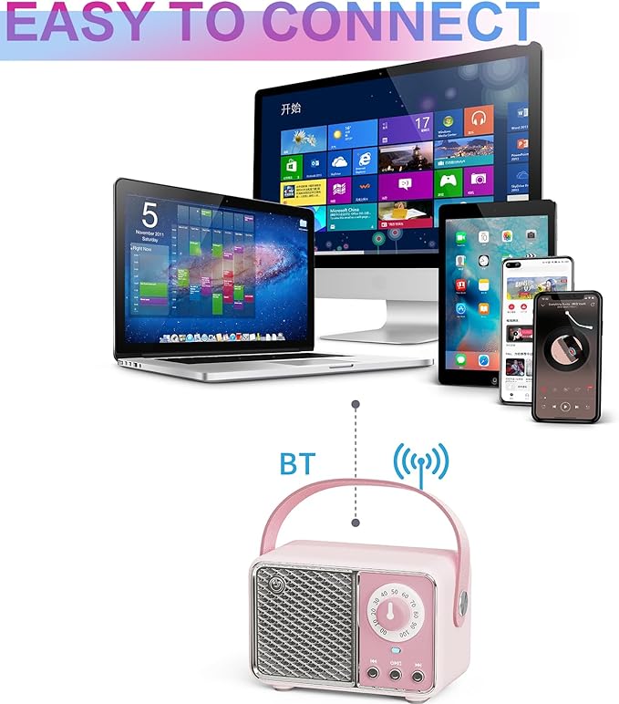 - 【 Bluetooth 5.0 technology& Crystal Clear Sound】: Equipped with advanced technology, compatible for all Bluetooth iPhone iPad Tablet .With the advanced Bluetooth5.0 technology, maintain a strong connection up to 32.8ft this retro Bluetooth speaker could connect with your smart equipment in less than one second.Cute Stereo Ultra mini but super loud. Whether you listen to country music, rock music or popular music, it will let you feel at the real concert scene.