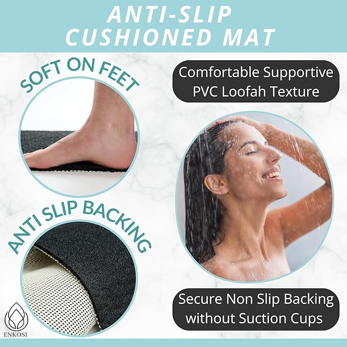 Soft Shower Mat Non Slip - PVC Loofah Inside or Outside Showers, Bathtubs, Bathrooms, and Wet Areas - Safe for Textured Tiled and Smooth Floor - No Suction Cups Secure Anti Slip (Black 24 x 47)