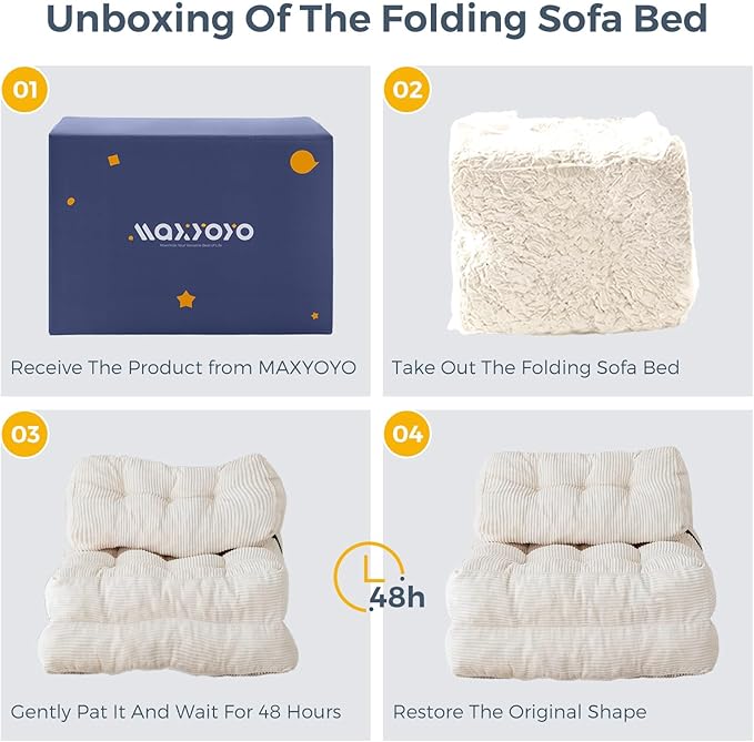 - Important Note: The chair bed is compressed and vacuum-sealed to reduce space and carbon dioxide emissions during shipping. Upon unpacking, allow the sofa bed to breathe for 48 hours to regain its original shape and size