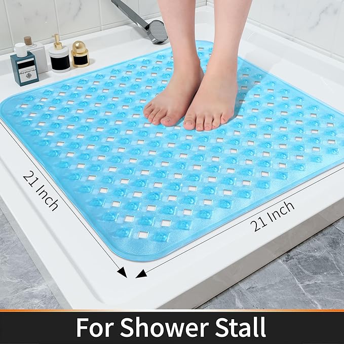 Yimobra Square Shower Mat Non Slip, Super Strong Suction Cups, 21"x21" Bath Tub Mat with Drain Holes, Machine Washable Fast Draining Bath Mats, Bathroom Essentials,Clear Blue