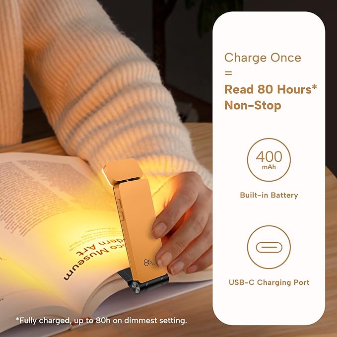 - Longlasting run time: This rechargeable reading light ensures you can enjoy focused reading without worrying about running out of power, with a runtime of up to 80 hours. It comes with a standard USBC cable for charging