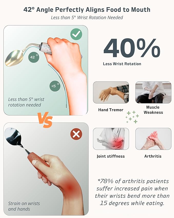 - ERGONOMIC 42° ANGLED DESIGN: Engineered for Parkinson's patients, elderly, and those with hand tremors or arthritis. Reduces wrist rotation and fatigue, promoting independent eating.