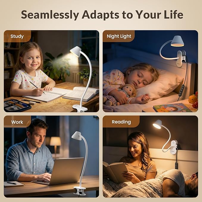 - 5 Color Temperatures& Stepless Dimming: From warm amber (2700K) for relaxing bedtime stories to cool daylight (6000K) for focused study or work. Smoothly adjust brightness from 2% to 100% glare-free light. This clip on light can create the suitable Light for everyone in the family and for all activities. Such as Reading, Working and Studying.