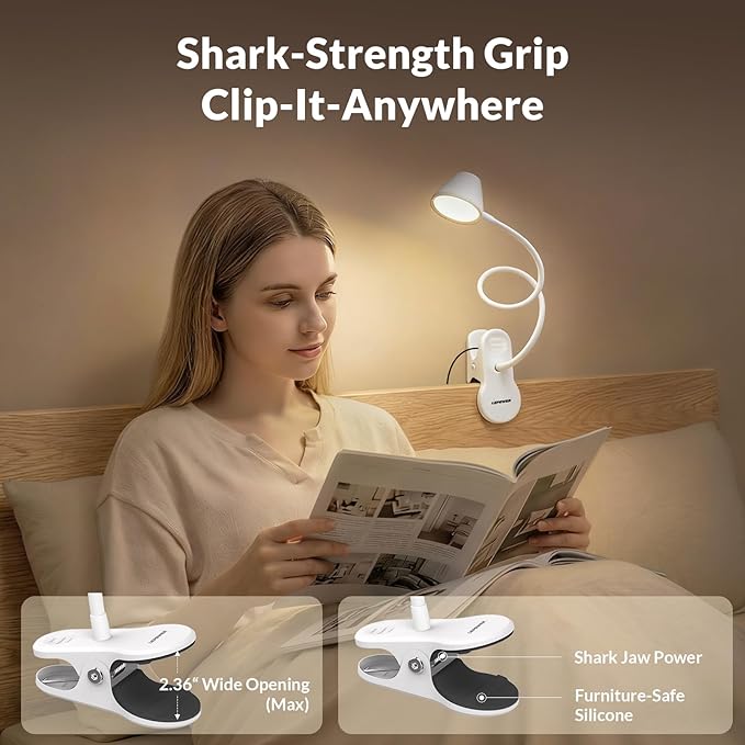 - 360° Gooseneck & Ultra-Strong "Shark-Jaw" Grip: This clip lamp uses an unique "shark-jaw" clamp to attach firmly to headboards (up to 2.3" thick), shelves, and cylindrical items. Silicone pad prevents scratches, making it ideal for reading, study, and crafting.