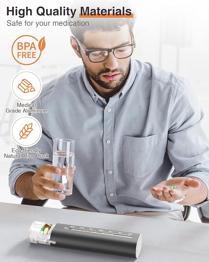 - 【Premium Aluminum & BPA-Free Interior – Durable and Safe Storage】 Crafted from anodized aluminum, the outer shell is scratch-resistant, fingerprint-resistant, and built to withstand daily wear, making it a standout among supplement organizer and vitamin organizer options. Inside, the tray is made from food-grade plastic reinforced with wheat straw fiber—odorless, heat-resistant, and durable. This combination of materials delivers lightweight strength and eco-friendly reliability, ensuring safe storage for all types of vitamins and medications.