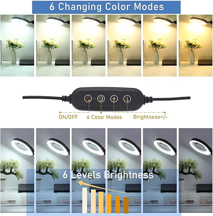 - 6 Color Modes with More Lighting Options: Our magnifying lamp offers 6-color modes and stepless dimming. Press the brightness button to switch to different color mode. Enjoy a range of lighting options to suit various environments, unlike other monochrome magnifiers. Achieve perfect lighting for sewing, needlework, coloring, puzzles, models, sculpting, embroidery, nail art, jewelry making, and more. Experience enhanced lighting options with our magnifier light.