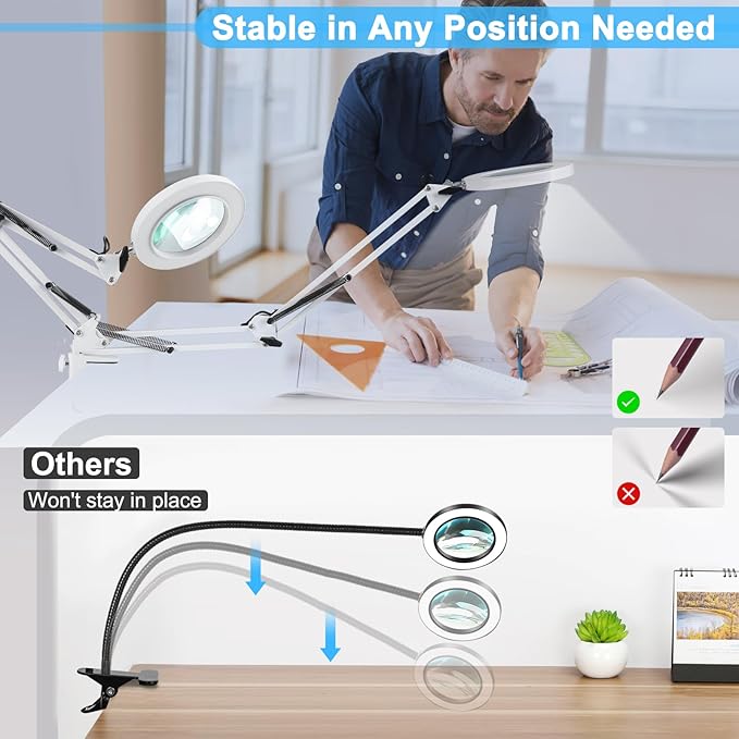 - 【Adjustable Swing Arm & Clamp Design】Enjoy the convenience of hands-free work with our magnifying glass with light and clamp. The adjustable swing arm is designed with 4 powerful springs and 3 knots to provide sturdy support, preventing any sagging and keeping the magnifying glass securely in place. No tools are required for installation! Desk magnifying glass can be effortlessly clamp to the edge of a flat surface, maximum thickness 2.1", widely used at desk, table, workbench, shelves, etc.