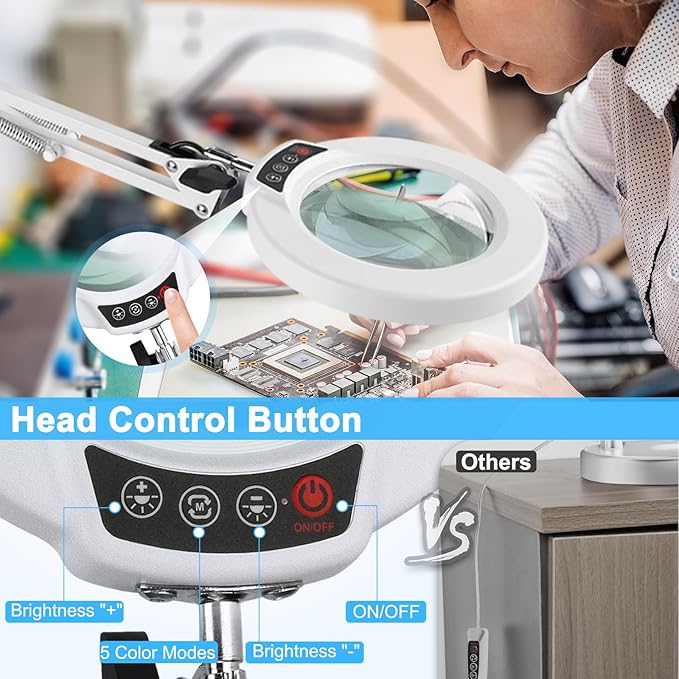 - 【Upgraded Head Button】The desk magnifying glass with light features an upgraded head button to experience hassle-free operation. Unlike other magnifying desk lamps with switches on the power cord, our head button allows for easy and intuitive control. And adjustable swing arm allows you to choose the angle you want. The magnifying glasses with light for close work make it easier to operate the buttons to adjust the 5 color modes and stepless dimming brightness.