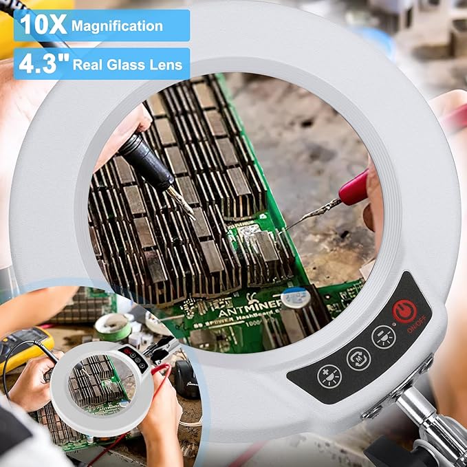 - 【10X Magnification & Real Glass Magnifier】Magnifying glass with light features a 4.3" real glass lens that provides a clear and distortion free view. The 10X magnifying glass lamp is especially suitable for crafts, reading, miniature painting, sewing, cross stitch, mini tasks, diamond painting, jewelry, hobbies, manicure, soldering, nails tech, beading, fly tying, needlework, puzzle, repair, drawing, book, needlepoint, knitting, etc. Our magnifier with light is designed to meet your needs.
