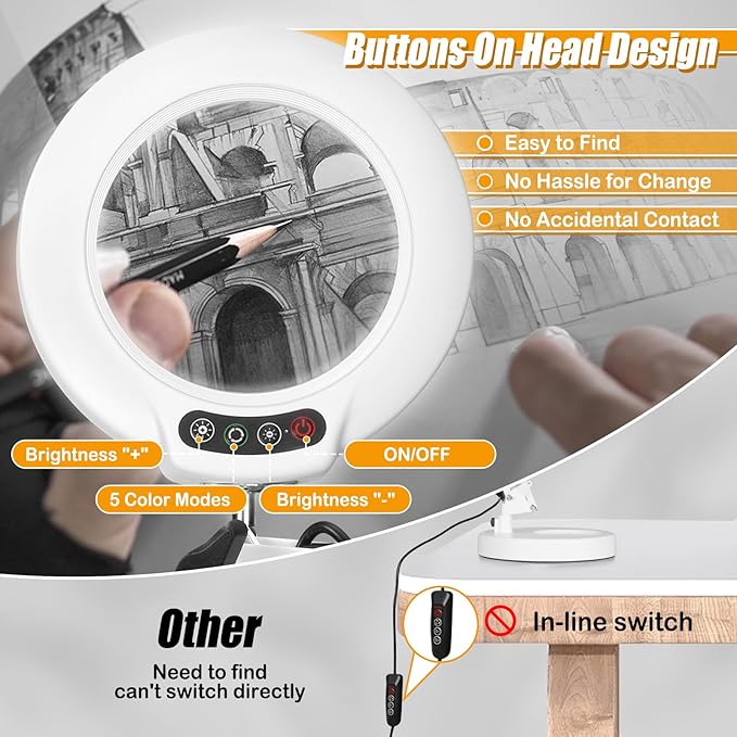 - 【Buttons on Head】 Our magnifier desk lamp features a convenient head-mounted button for easy access to lighting settings, eliminating the need to bend or search for switches. Also, adjust lighting without worrying about accidental touches during your work. Ideal for watch repair, nail tech, tattoo, mini tasks, solder, puzzles, projects, professional, plant, needlework, miniatures, manicure, lash, embroidery, electronics, diamond art, cross stitch, and other close work.