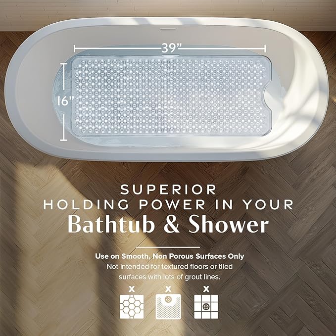 - Oversized Full-Tub Coverage: Measuring 39”L x 16”W, this extra-long mat covers 30% more surface area than standard bath mats, providing enhanced safety for seniors, children, and babies during baths or showers.