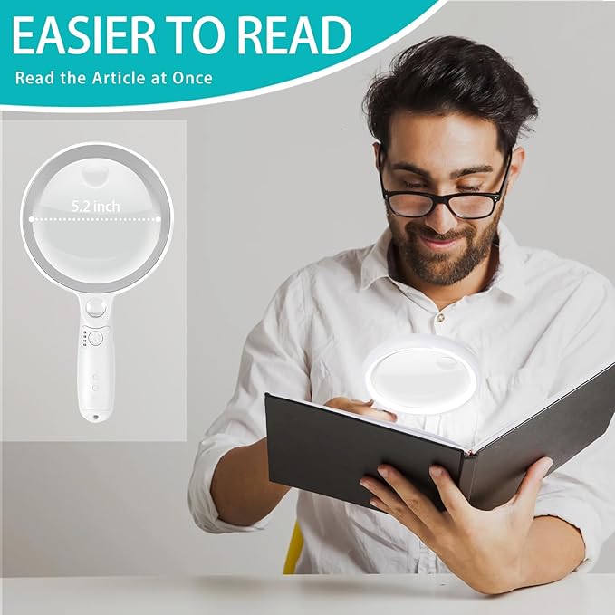 - CRYSTAL CLEAR OPTICAL GRADE LENS: Enjoy a distortion-free image with our shatterproof and scratch-resistant 5.2-inch magnifying glass. Perfect for reading books, magazines, maps, and engage in hobbies and crafts.