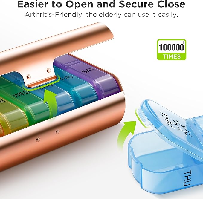 - Easy to Use & Portable: This medicine pill organizer features clever design with prominent lid edges, a spacious opening, and easy operation, making medication retrieval very convenient. even for elderly or arthritis patients. Each day's pill case fits neatly into your wallet or pocket, and the metal casing of the morning and night pill boxes not only protects your medication privacy but also allows for a week's worth of pills to be carried during travel.