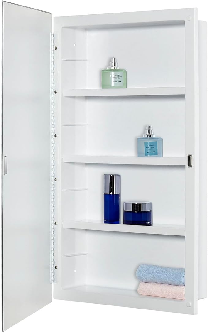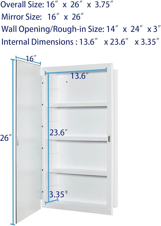 Plastic Medicine Mirror Cabinet for Bathroom 16 x 26 inch, Surface and Recessed Mount