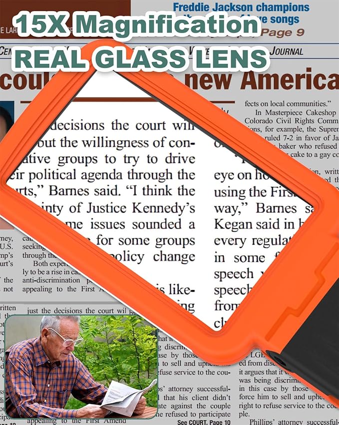 - 15X Rectangular Glass Lens: Unlike traditional round lenses that can distort edges, our 15x handheld magnifying glass uses a high quality rectangular glass lens, ensuring a clear and accurate view without unwanted distortion, perfect for reading small print, magazines, photos, jewellery and crafts of all kinds.