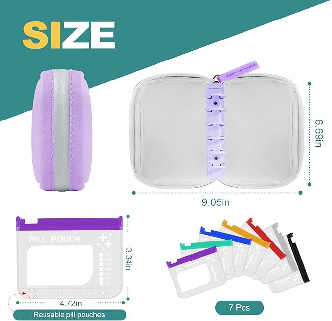 - STYLISH PILL ORGANIZER BAG - The Timueetech pill organizer bag includes a binder, paired with 7 EVA pouches, which can be used to store your pills and medications, or small jewelry such as earrings, rings, etc