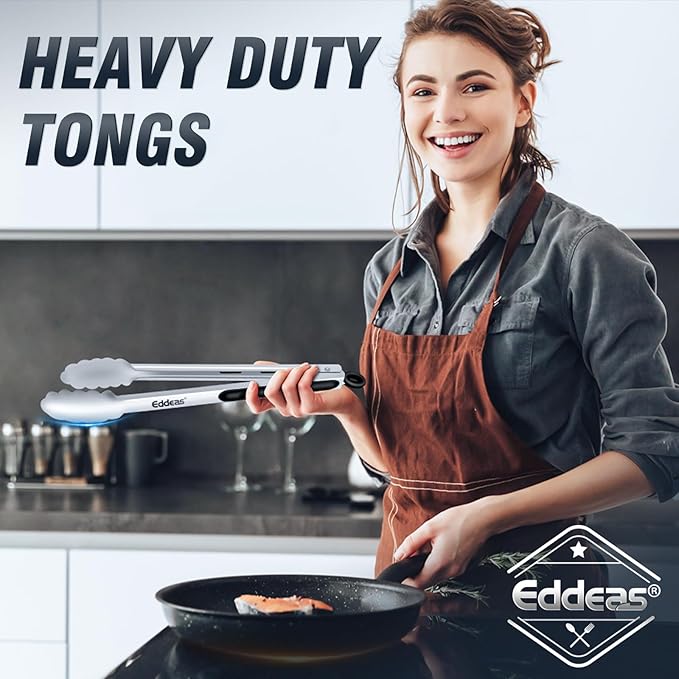 - FOOD-GRADE STAINLESS STEEL - Eddeas kitchen tongs for cooking are made of 1mm thick food-grade stainless steel in one piece for enhanced robustness and heat resistance, rust resistance and easy handling. The overall light weight and ergonomic features are maintained.