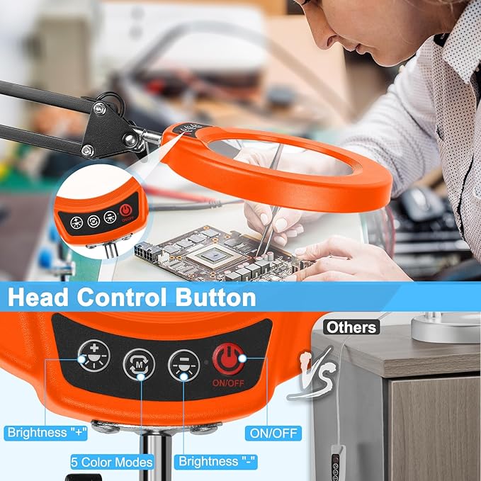 - 【Upgraded Head Button】The desk magnifying glass with light features an upgraded head button to experience hassle-free operation. Unlike other magnifying desk lamps with switches on the power cord, our head button allows for easy and intuitive control. And adjustable swing arm allows you to choose the angle you want. The magnifying glasses with light for close work make it easier to operate the buttons to adjust the 5 color modes and stepless dimming brightness.