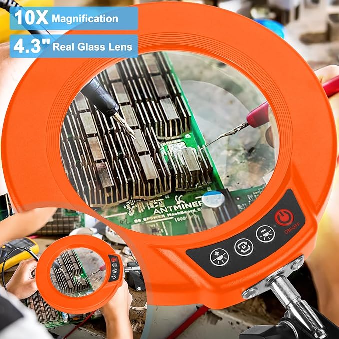 - 【10X Magnification & Real Glass Magnifier】Magnifying glass with light features a 4.3" real glass lens that provides a clear and distortion free view. The 10X magnifying glass lamp is especially suitable for crafts, reading, miniature painting, sewing, cross stitch, mini tasks, diamond painting, jewelry, hobbies, manicure, soldering, nails tech, beading, fly tying, needlework, puzzle, repair, drawing, book, needlepoint, knitting, etc. Our magnifier with light is designed to meet your needs.
