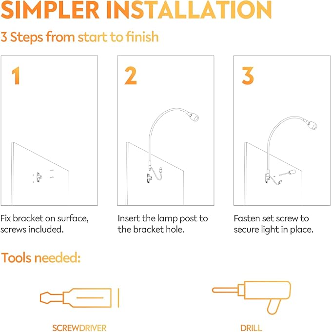 - Split Bracket, Simple to Install: The small all-aluminum bracket can be flexibly mounted on the wall beside bed, wooden bed frame or headboard, then secure the lamp to bracket by set screw. Setup is easy and fast, just a few minutes to complete