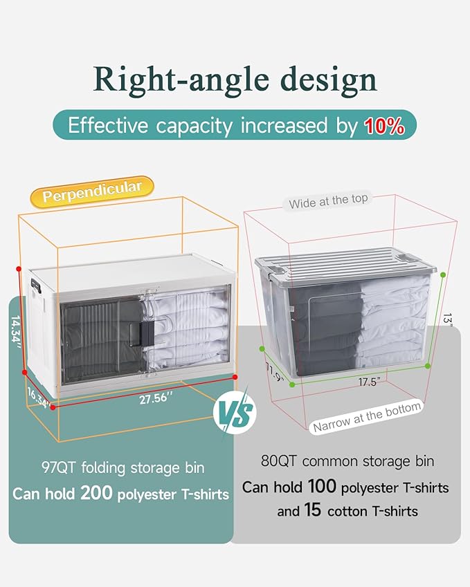 - Large Capacity: With dimensions of 27.56 inches (L) x 14.76 inches (W) x 16.34 inches (H) (2.17 inches when folded), these storage bins offer a spacious capacity of up to 97 quarts (24.25 gallons). They comfortably hold everyday items like cleaning supplies, snacks, office materials, and seasonal decorations. Their robust construction can support weights of up to 500 pounds (225KG) of weight, making them suitable for heavier items like books and tools