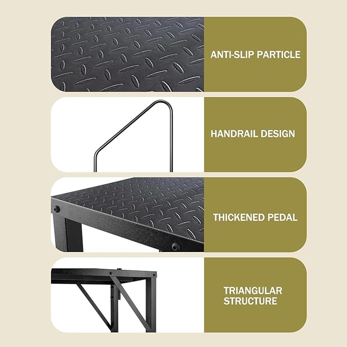 - 【Stable Triangle Structure】: Our camper ladders are made of high-grade steel frame structure, the heavy duty step ladder has higher strength and reliability than other wood or plastic step ladders. The triangular structure between the steps of our RV ladders strengthens the basic support, which will make the spa steps stronger and more stable