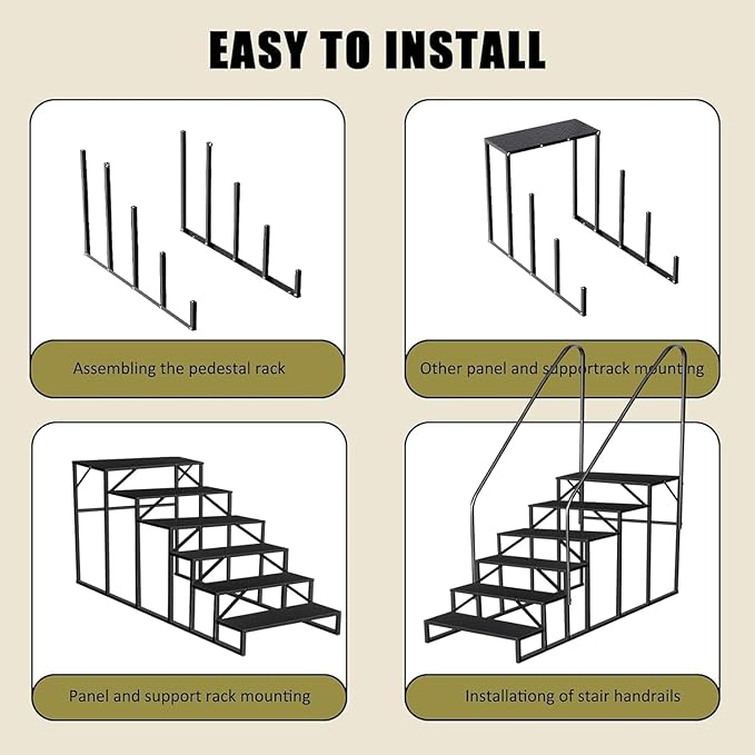 - 【Mobile Home Stairs Wide Use】: Our safety camper steps can be used both indoors and outdoors. Our swimming pool ladder above ground provides extra height for stage, storage room, truck, travel, outside, exercise and therapy. And the portable outdoor stairs can also be used as a decorative shelf, tall bed step, inflatable hot tub accessories, medical step stool with rails in house and RV entry. Wherever requires climbing, mobile home steps is an ideal choice!