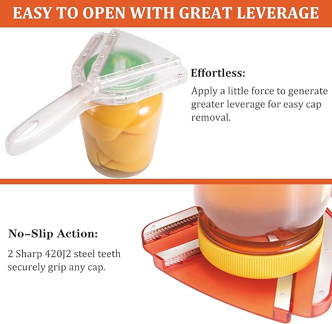- Easy effective:Sharp dual stainless steel teeth grip lid firmly, reducing force required to open jar,contoured non-slip handle for better leverage,allowing the opener to do the work rather than your hands and wrists.