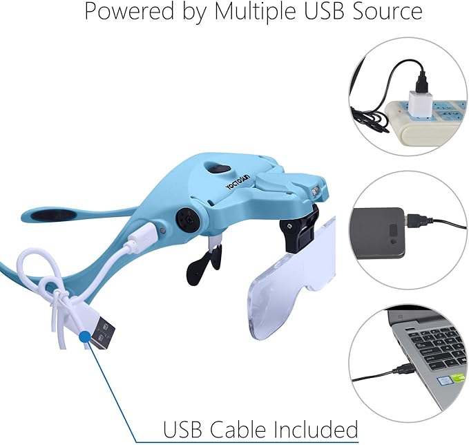 - RECHARGEABLE DESIGN:This magnifying glass with light is equipped with a rechargeable built-in lithium battery and comes with a USB charging cable, simply plug the cord into the magnifier and the other end into the slot of a USB power source(such as a USB wall charger, a cell phone charger or a power bank, not included) and it automatically charges. Save money and energy while enjoying long lasting bright light. You will never need to buy batteries again!