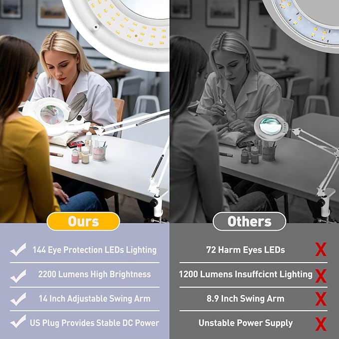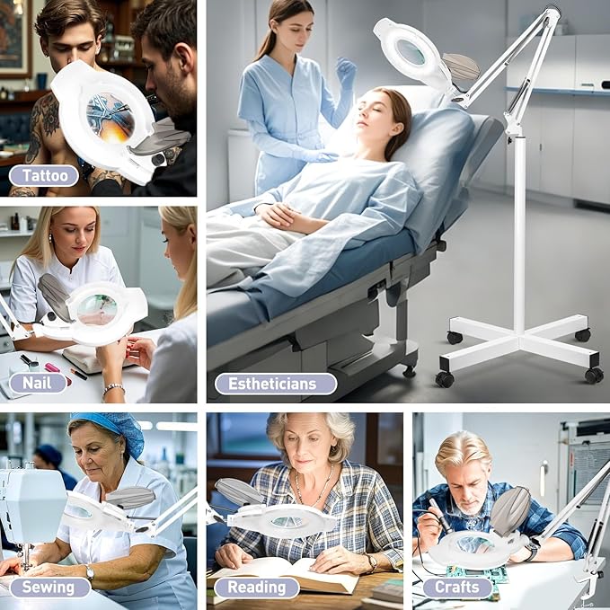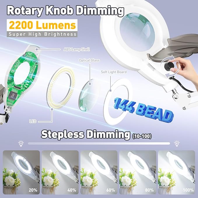 - 2200 Lumen High Brightness: This standing magnifying glass with light uses 144 LEDs to deliver 2200 lumens and a 6000K daylight color temperature, offering glare-free lighting to reduce eye strain. The head-mounted dimmer knob on the esthetician lamp allows for stepless brightness adjustment from 10% to 100%, ensuring customizable lighting for any task. Equipped with a 110V-220V US plug, it ensures stable DC current for consistent lighting, perfect for reading, crafting, or work.