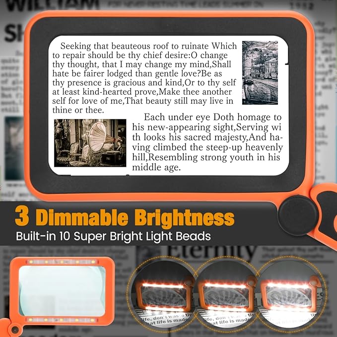 - Comfortable, Adjustable Lighting: Equipped with 10 ultra-bright LEDs and 3 adjustable brightness levels, the magnifier with light ensures comfortable reading even in low-light conditions. The touch switch makes it easy to adjust the brightness, making it ideal for long reading sessions while reducing eye strain