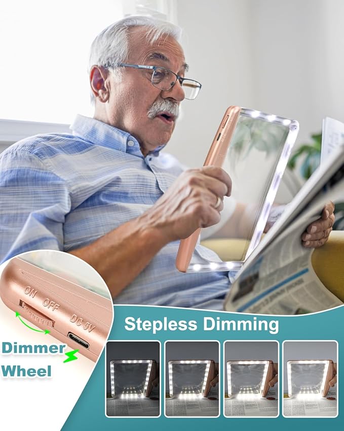 - Bright LED Illumination with Adjustable Brightness: Equipped with 20 ultra-bright LED lights, this handheld magnifier ensures even lighting across your reading area, reducing eye strain and providing clear, crisp visibility. The easy-to-use dimmer switch lets you customize the brightness to suit any environment, giving you the perfect amount of light for reading, crafting, or detailed work.