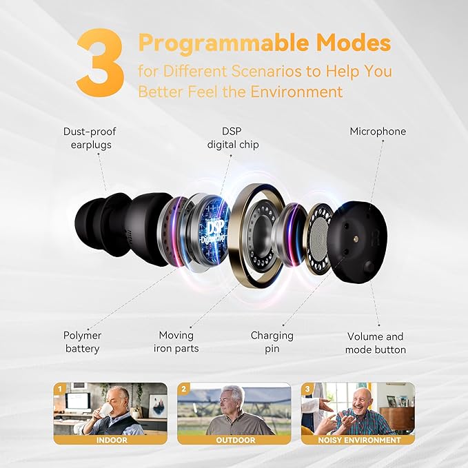 - 3 Levels Volume and Intelligent Noise Reduction: Our rechargeable hearing aids for seniors have three modes for indoor, outdoor and noisy environments, double-click 2 times to adjust. Hearing amplifier comes with a noise reduction function, which helps to hear the sound better, which is unique to professional OTC hearing aids.
