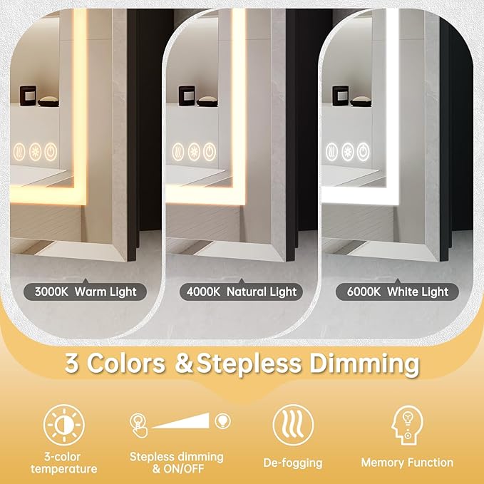 - STEPLESS ADJUSTABLE LIGHTING: Long press the mirror button to adjust the brightness of the front of the illuminated medicine cabinet from 10% to 100%, with 3 color temperature design, you can choose from warm white 3000K, natural light 4000K and bright white 6000K. The light memory function makes you more convenient and comfortable to use.