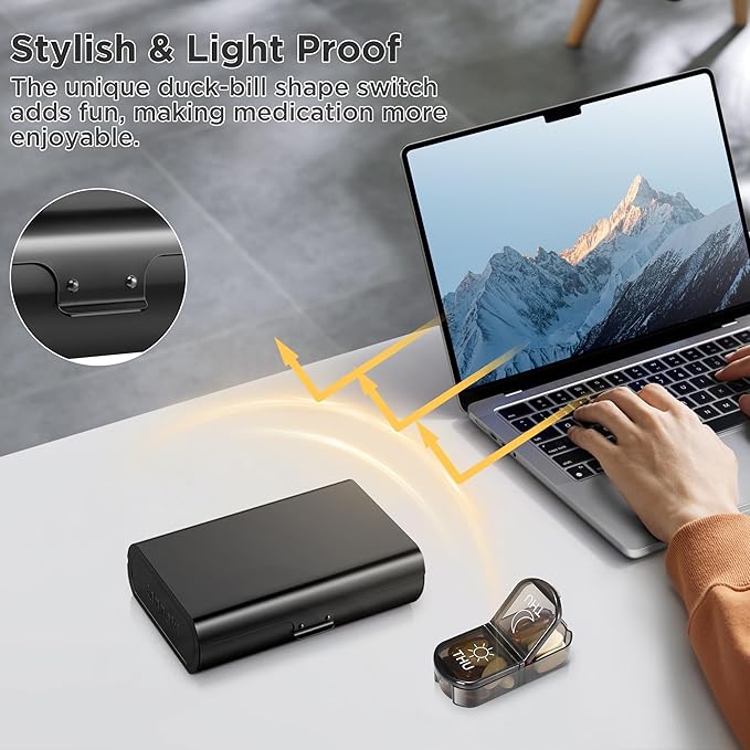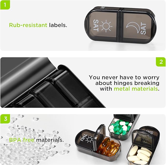- Long-lasting Design: Unlike other cute pill holder on the market, this vitamin organizer features an upgraded outer hinge with a built-in steel pin for enhanced longevity and reliability. The hinge can withstand over a million uses without the pin not falling. The medication organizer letters are UV printed, lasting over 10,000 uses, never worry about the rub-off labels.