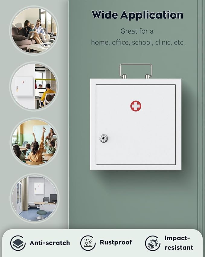 - Sturdy & Secure: Well-constructed by rigid steel with a white coating, the medical cabinet is resistant to rust, scratch or impact. Thick and solid metal plate prevents it from being pried open, guaranteeing your exclusive access to the items inside