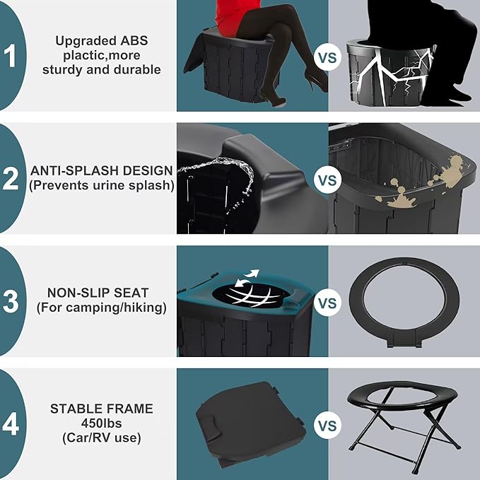 - Heavy-Duty & Splash-Proof: Made of ultra-sturdy ABS material with a 440 lb weight capacity. Features a contoured bucket toilet seat with lid and splash guard to prevent spills, ensuring comfort for adult portable toilet use