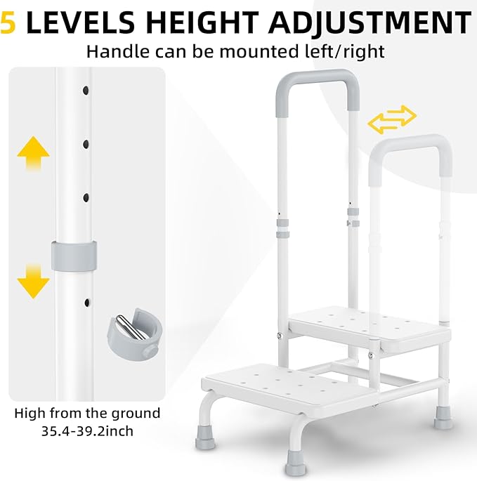 - [5 Height & Position Adjustable Handrail]: The 2 step stool includes an upgraded handrail with 5 adjustable positions, accommodating different heights and scenarios. The handrail can be adjusted from 35.2'' to 39.2'' and can be mounted on either the left or right side. A convenient hook is also provided for hanging towels and other items, enhancing user comfort and convenience